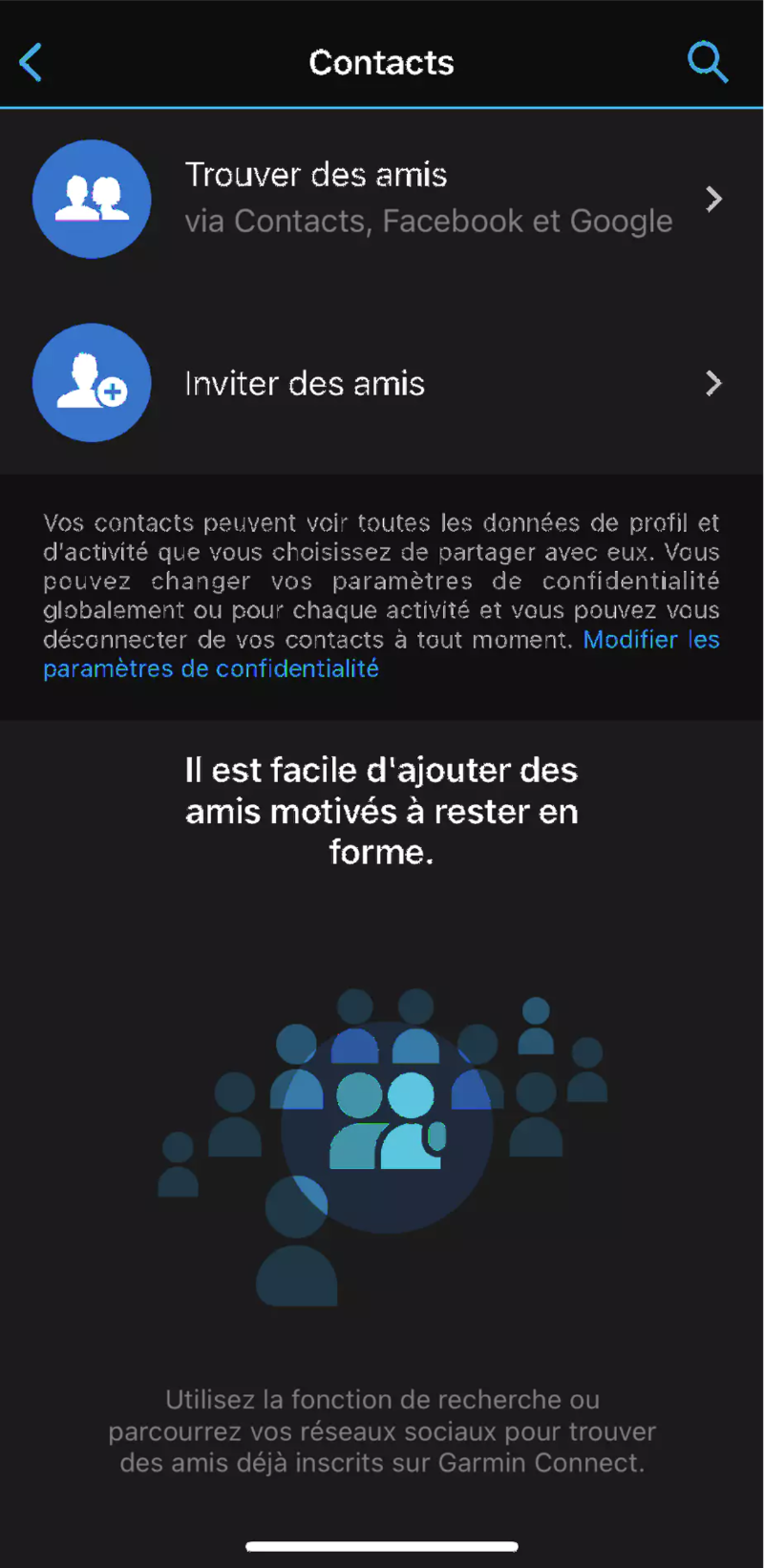 Il est également possible de se connecter avec ses amis dans l'application Garmin Connect.