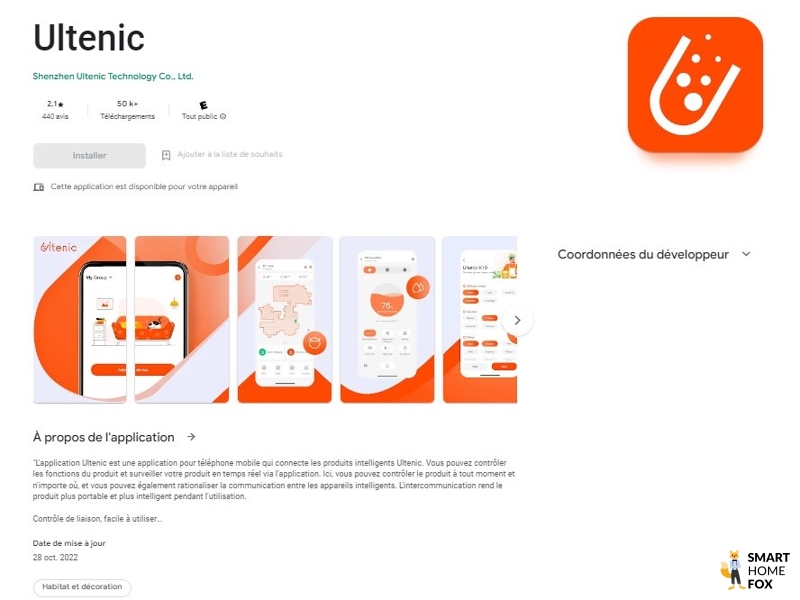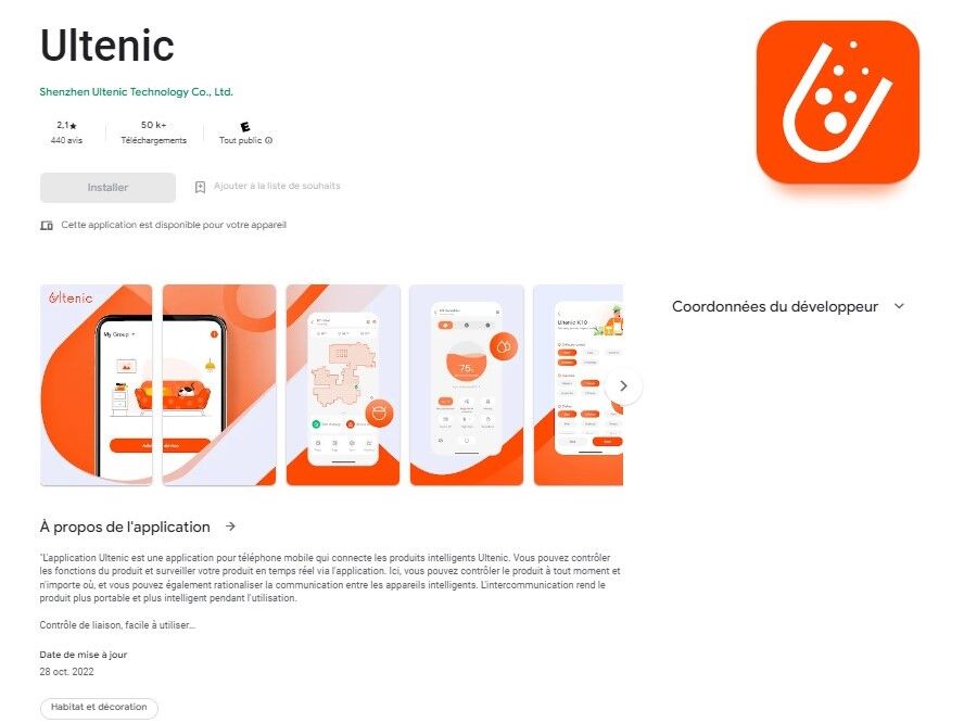 L’ensemble des fonctionnalités de l’appareil est uniquement accessible avec l’application Ultenic. Celle-ci est téléchargeable gratuitement sur Android et iOS.